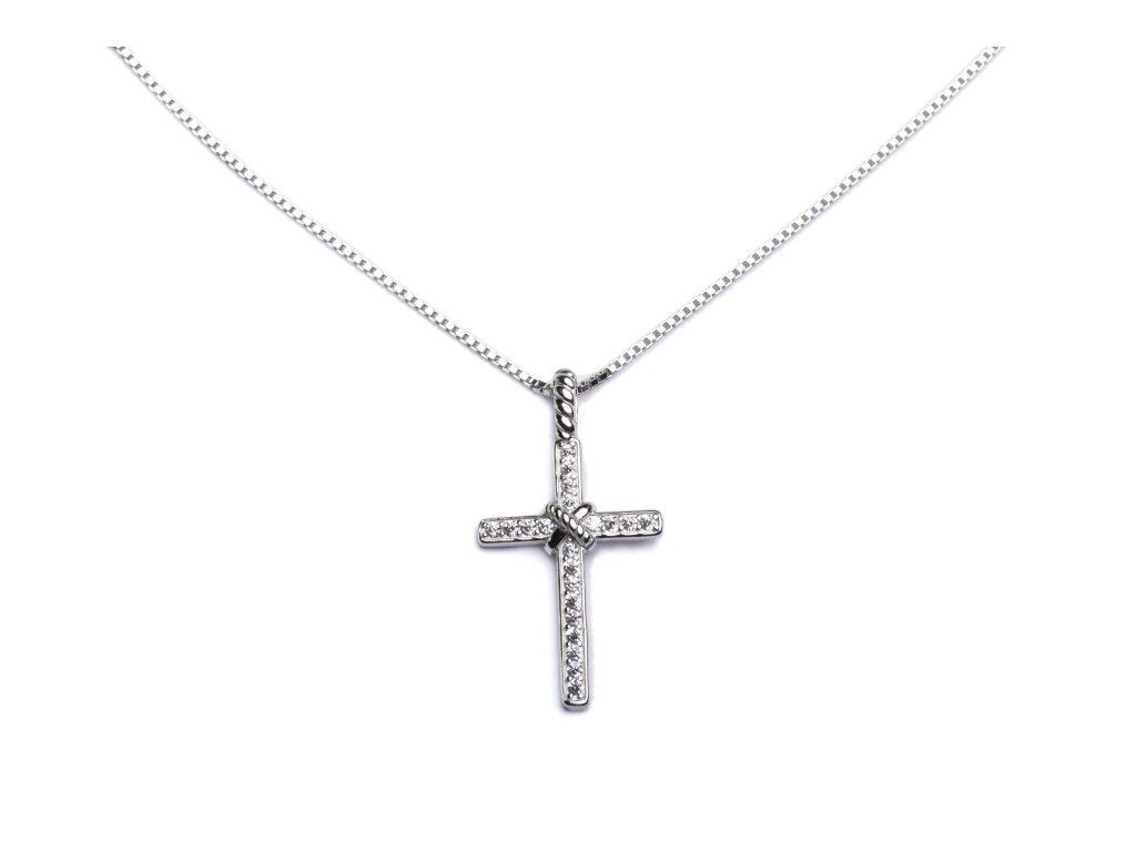 Stříbrný náhrdelník s jemným křížkem zdobeným třpytivými zirkony.