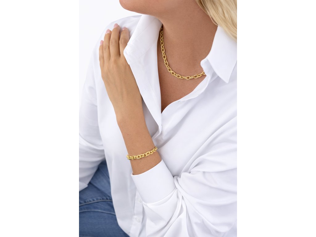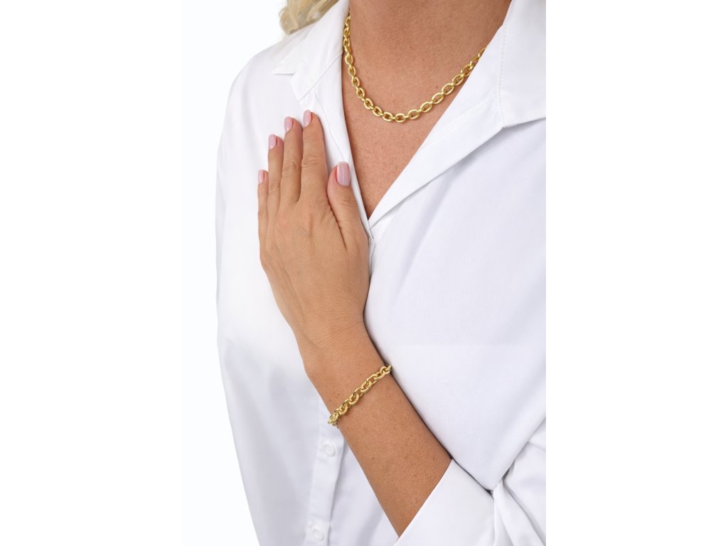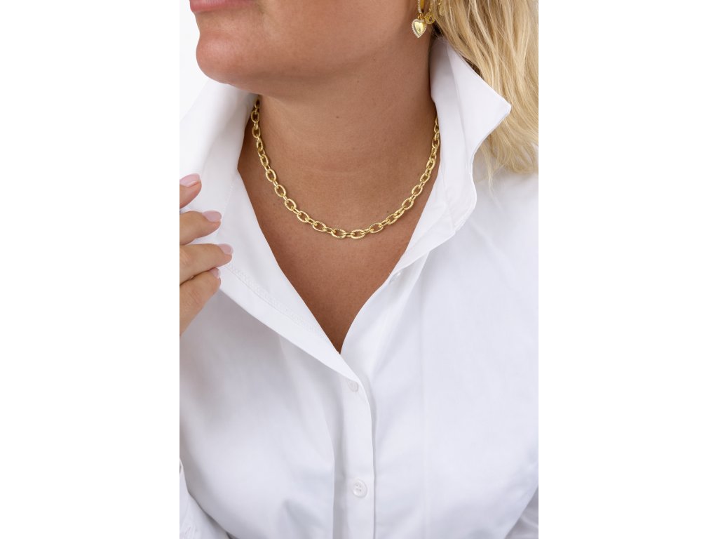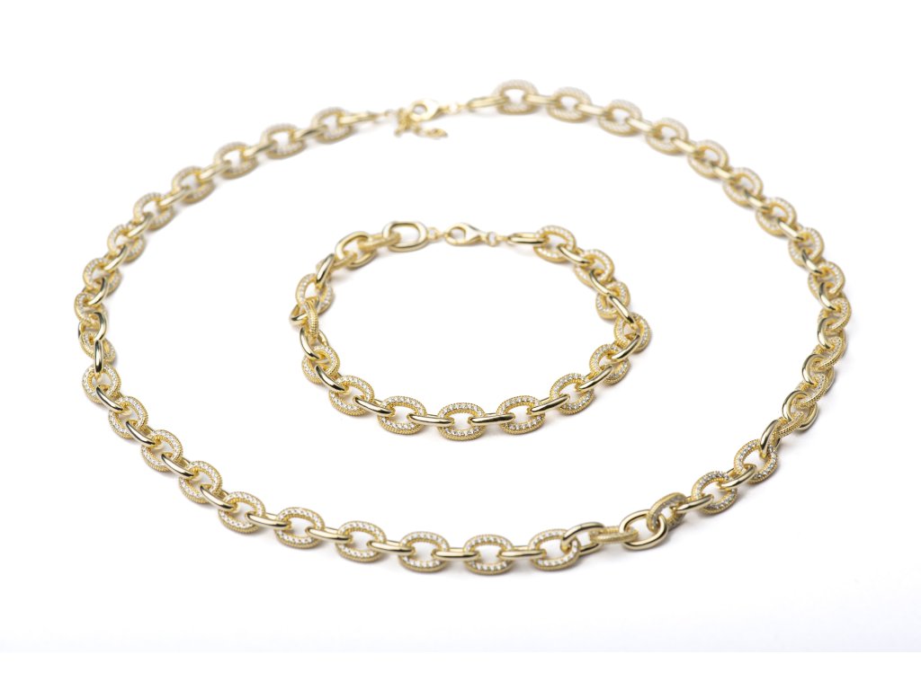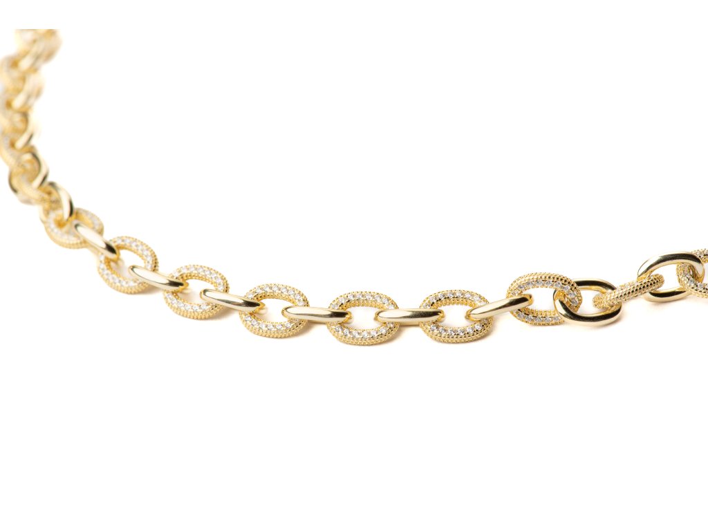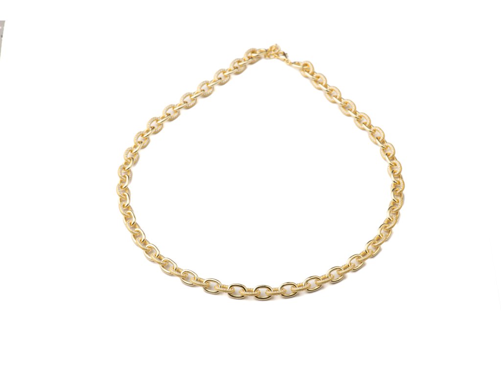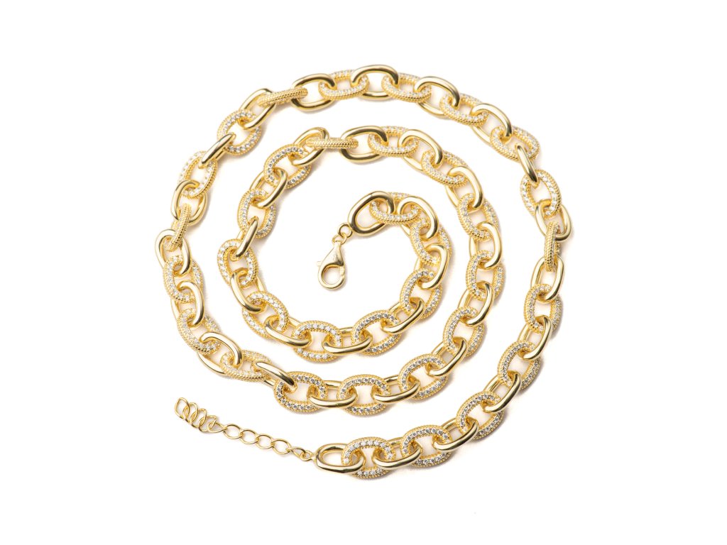 Luxusní masivní náhrdelník zaujme precizním osazením třpytivých zirkonů, které vytvářejí fascinující hru světla a dodávají šperku exkluzivní třpyt. Robustní a výrazná konstrukce zároveň působí sofistikovaně a majestátně, čímž se stává nepřehlédnutelným doplňkem pro slavnostní i večerní outfity. Náhrdelník je ideální pro ženy, které chtějí podtrhnout svou osobitost, sebevědomí a smysl pro luxusní styl, přičemž každý detail odráží pečlivou preciznost a eleganci.