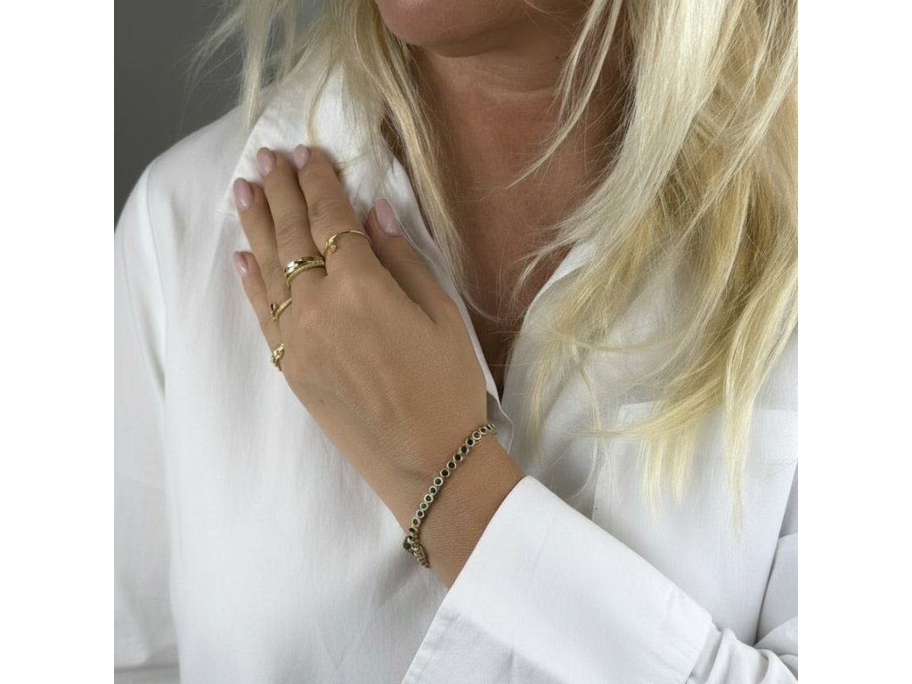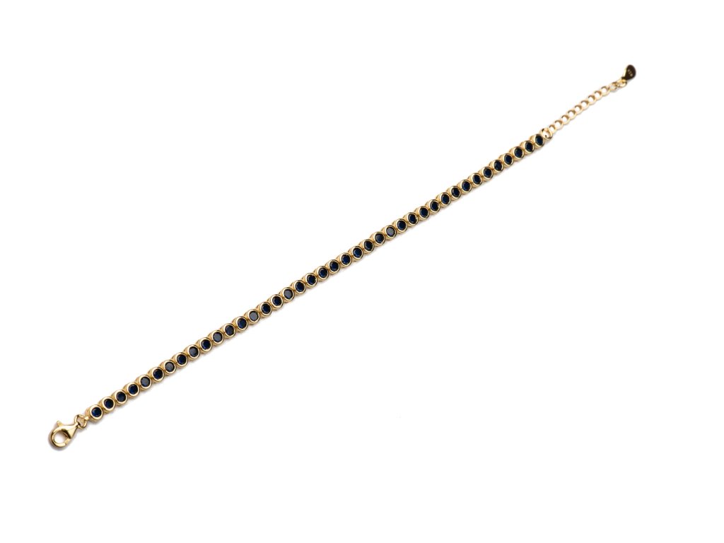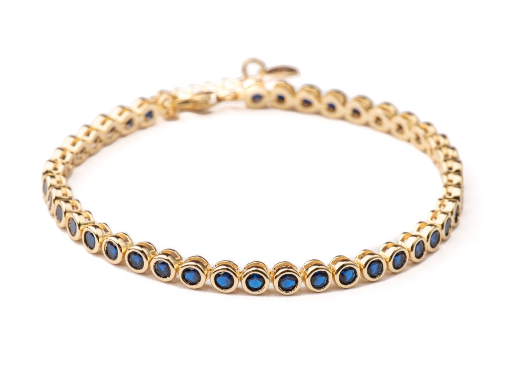 Luxusní náramek v teplém zlatém tónu, osazený řadou precizně broušených modrýchzirkonů, které vytvářejí souvislou linii oslnivého třpytu. Elegantní kulaté zasazení kamenů podtrhuje čistý, nadčasový design a dodává šperku noblesní charakter. Vysoce leštěné provedení působí mimořádně sofistikovaně a činí z tohoto náramku dokonalý doplněk pro slavnostní příležitosti, večerní události i jako výjimečný luxusní dárek.