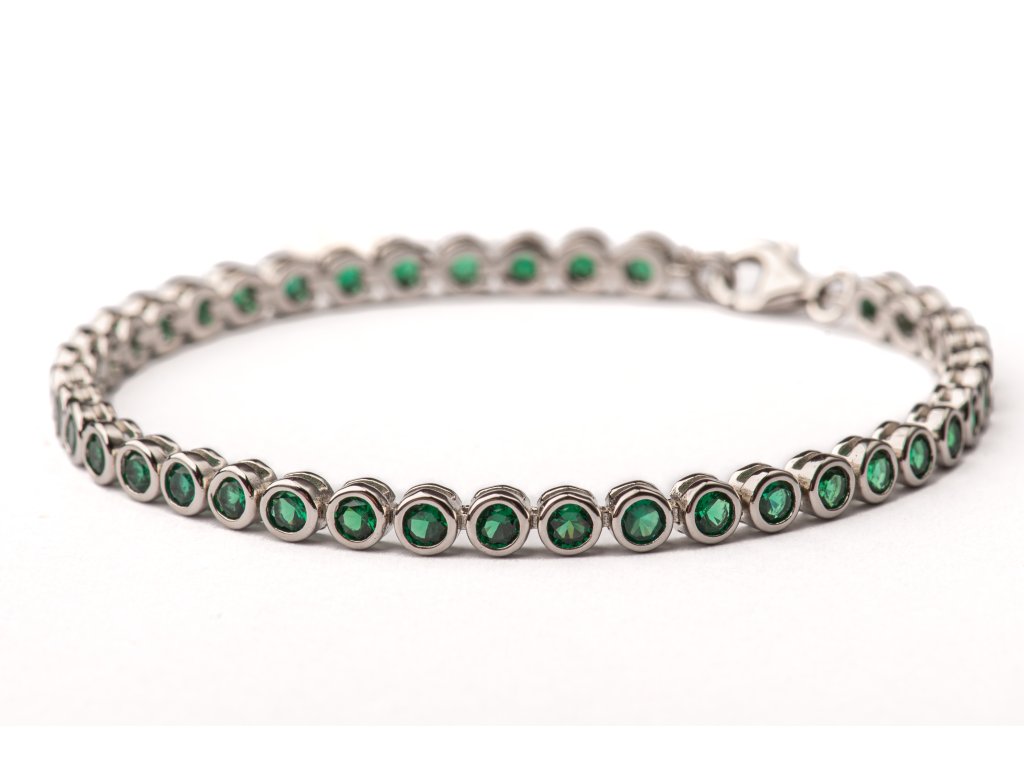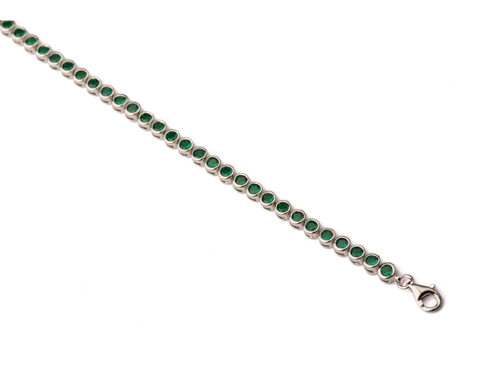 Elegantní náramek osazený řadou precizně broušených zelených zirkonů, které vytvářejí nepřerušenou linii intenzivního třpytu. Ušlechtilý kov v kombinaci se sytě zelenými kameny působí mimořádně sofistikovaně a nadčasově. Tento šperk je ideální volbou pro ženy, které hledají luxusní doplněk s výrazným, ale elegantním barevným akcentem.