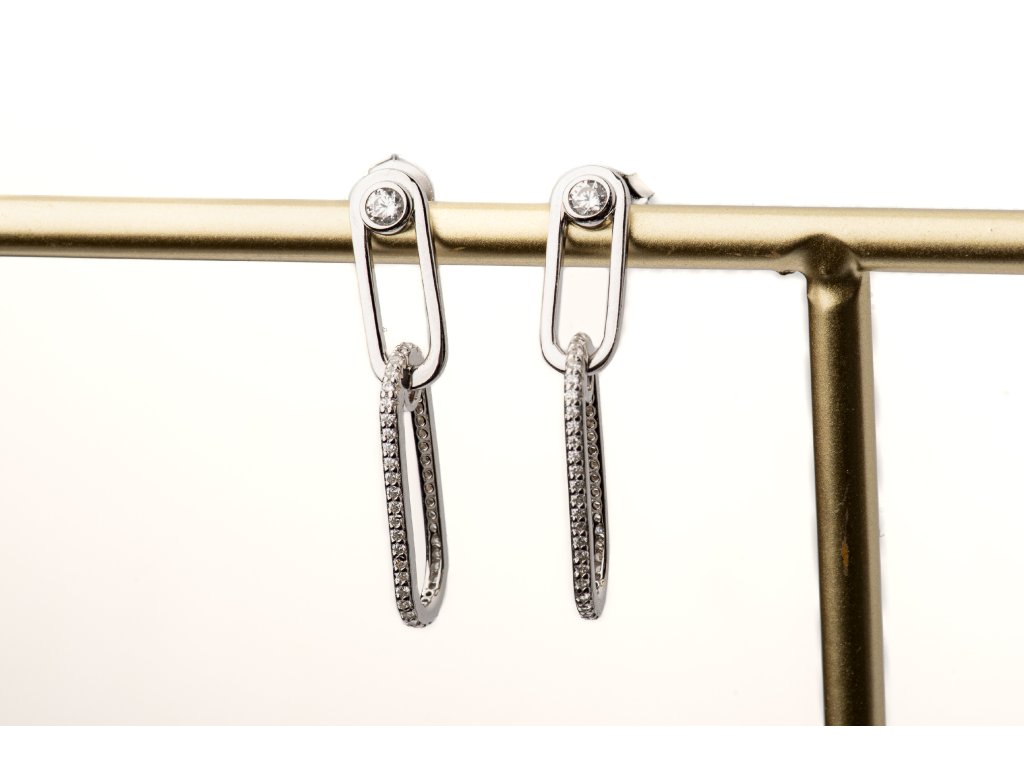 Náušnice - dva ovály se zirkony, stříbrné (rhodium) - 3,5 cm