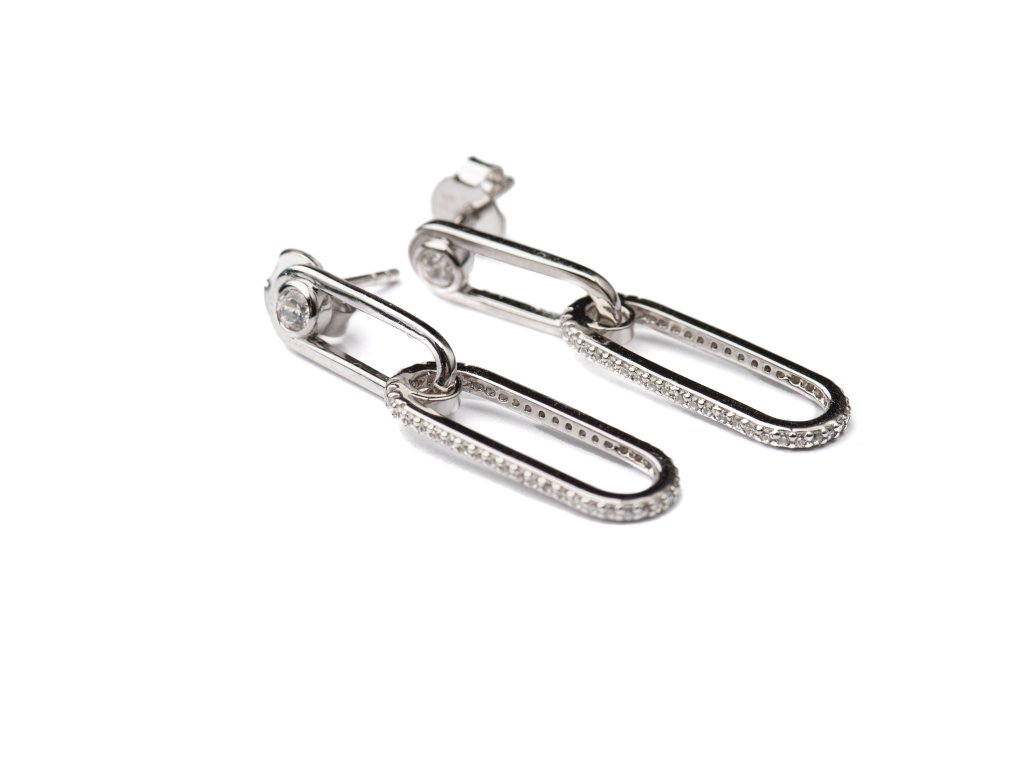 Exkluzivní visací náušnice jsou precizně osazeny třpytivými zirkony po celé délce oválného očka. Sofistikované zapínání na puzetu zajišťuje elegantní a bezpečné nošení.