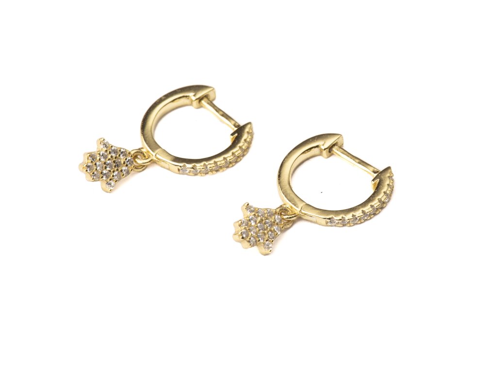 Elegantní náušnice s motivem ruky, precizně vykládané třpytivými zirkony – symbol ochrany v luxusním provedení.