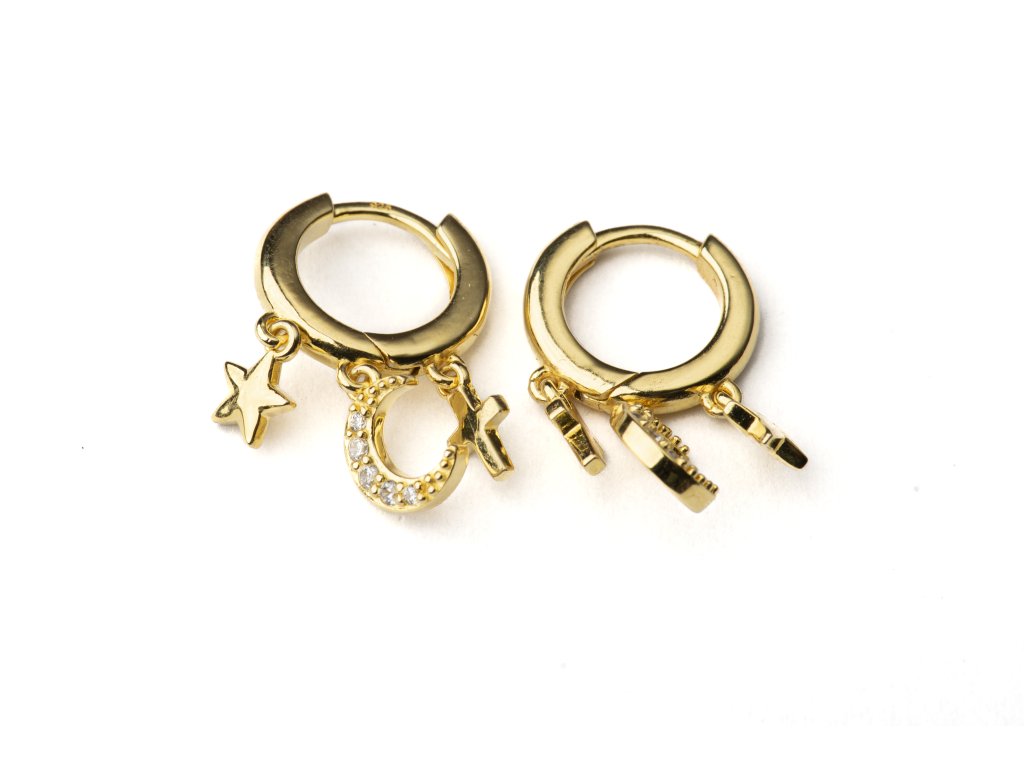 Stylové pozlacené stříbrné kroužkové náušnice s jemnými přívěsky v symbolických tvarech, doplněné třpytivými zirkony