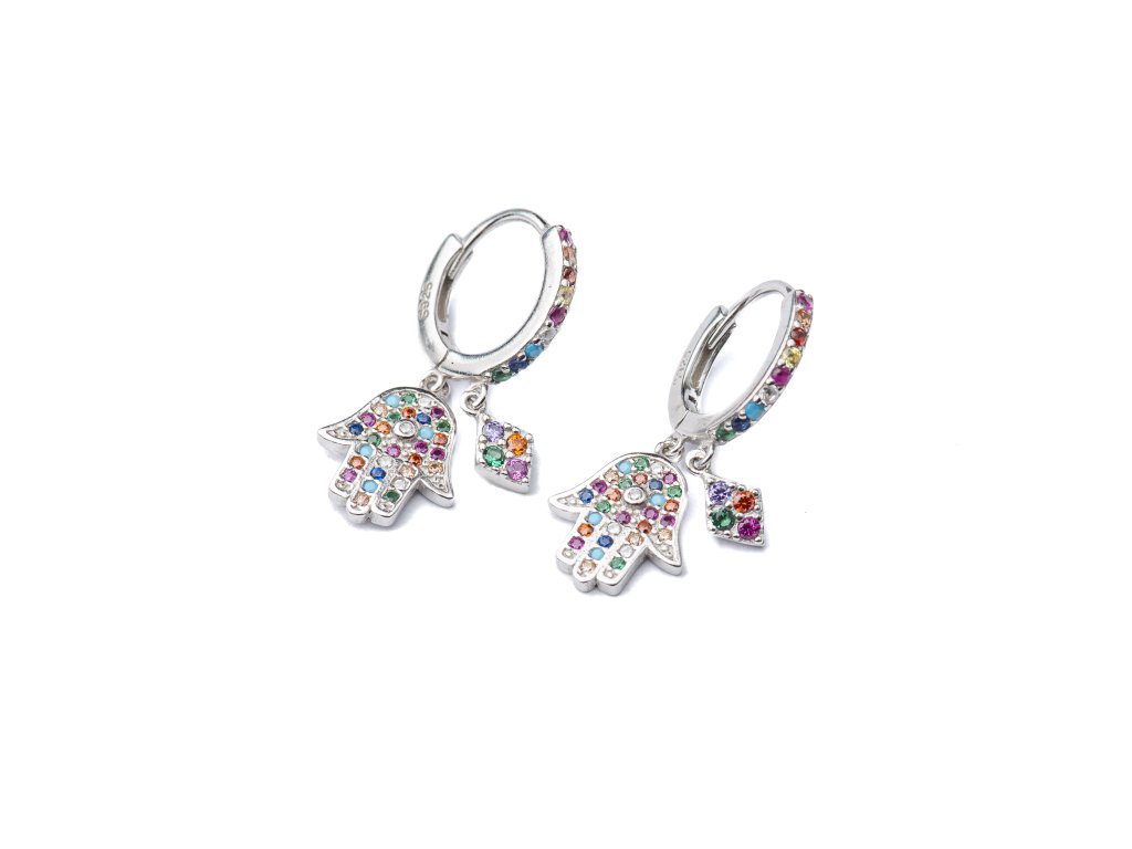 Elegantní náušnice s rukou Fatimy zdobené barevnými zirkony spojují symboliku ochrany s jemným luxusem.