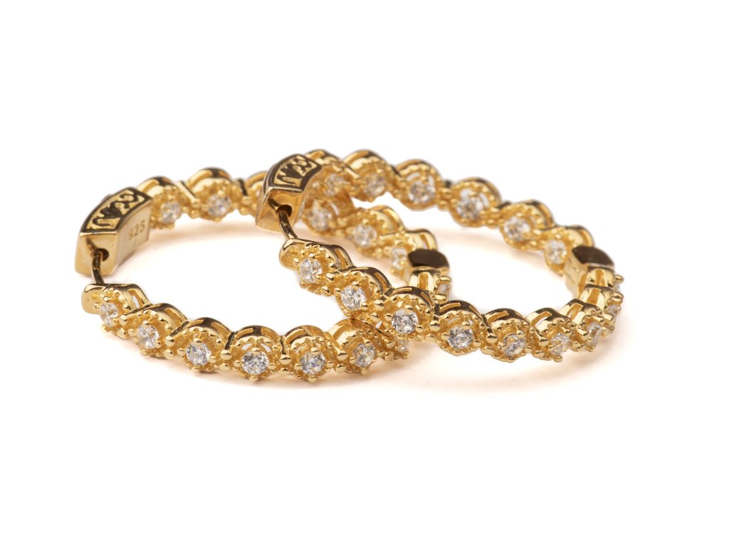 Exkluzivní pozlacené kruhové náušnice osazené zářivými zirkony, které okouzlí nadčasovou elegancí a noblesním třpytem.