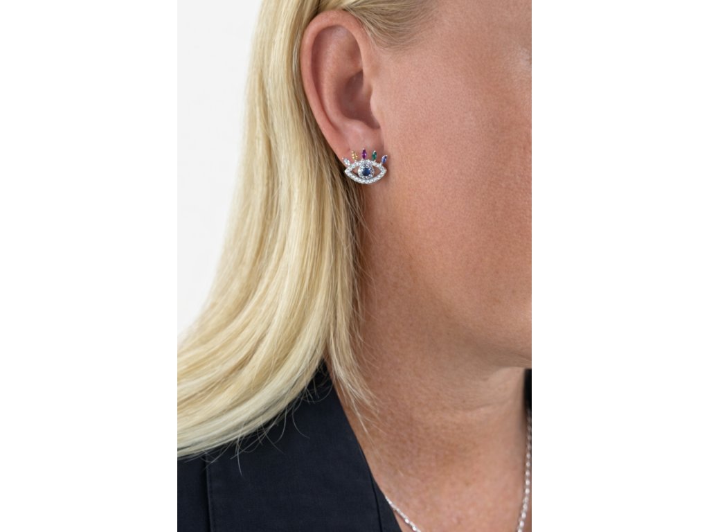 Náušnice jsou malý šperk s velkým efektem. Motiv oka je osazený třpytivými kamínky a barevnými „řasami“, takže působí luxusně, hravě a trochu jako talisman pro štěstí.