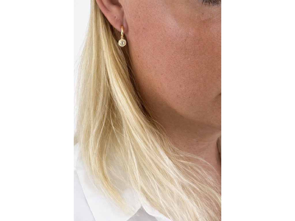 Jemné pozlacené náušnice s kruhem osázeným jiskřivým zirkony — nadčasová elegance pro jedinečné chvíle.