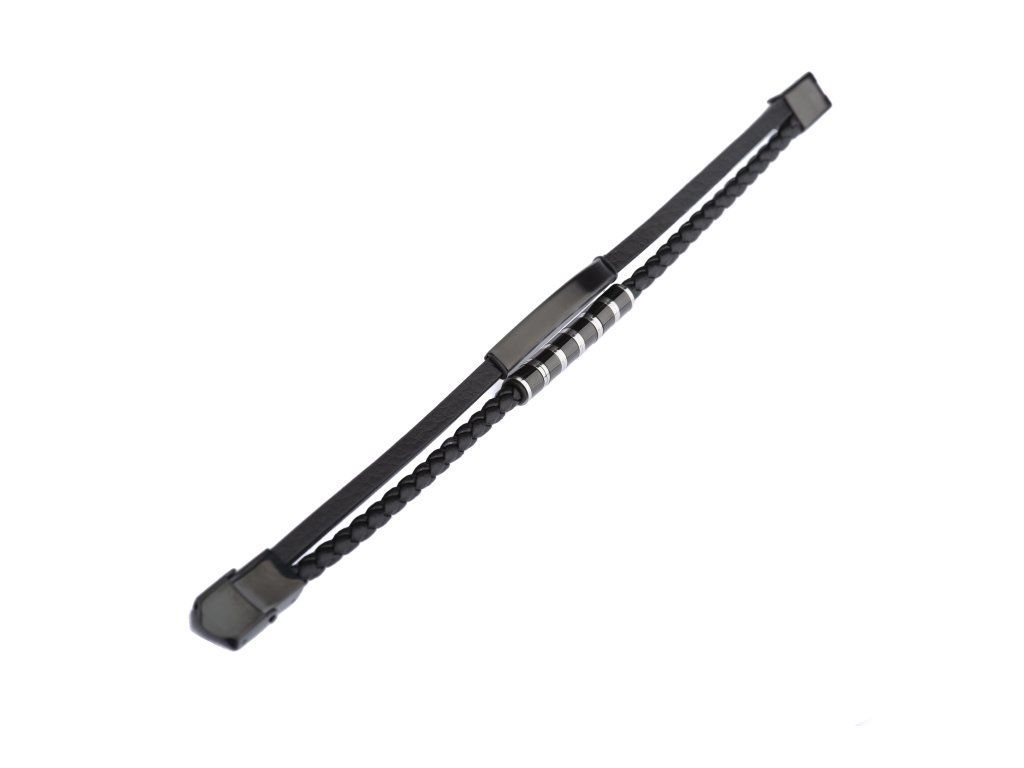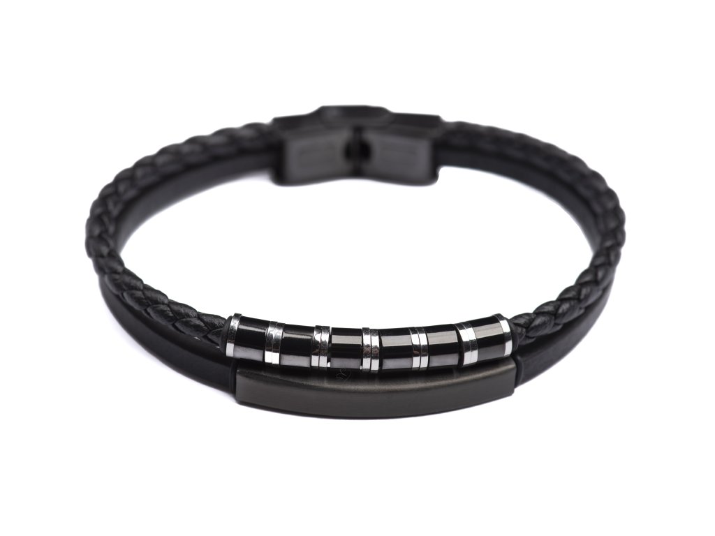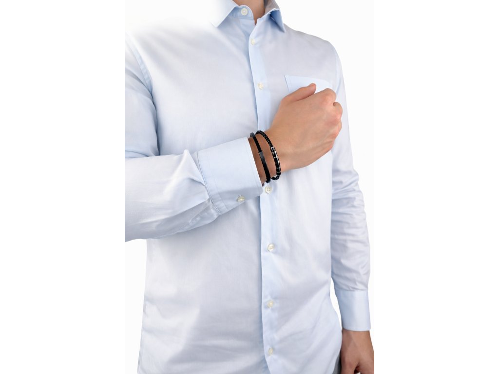 Luxusní náramek je navržen pro muže, kteří oceňují precizní zpracování a čistý, sebevědomý design. Kombinace hladkého a pleteného černého materiálu vytváří sofistikovaný kontrast, který je zvýrazněn leštěnými kovovými prvky v tmavém, elegantním tónu. Ty dodávají náramku jemný lesk a pocit exkluzivity, aniž by působily okázale.