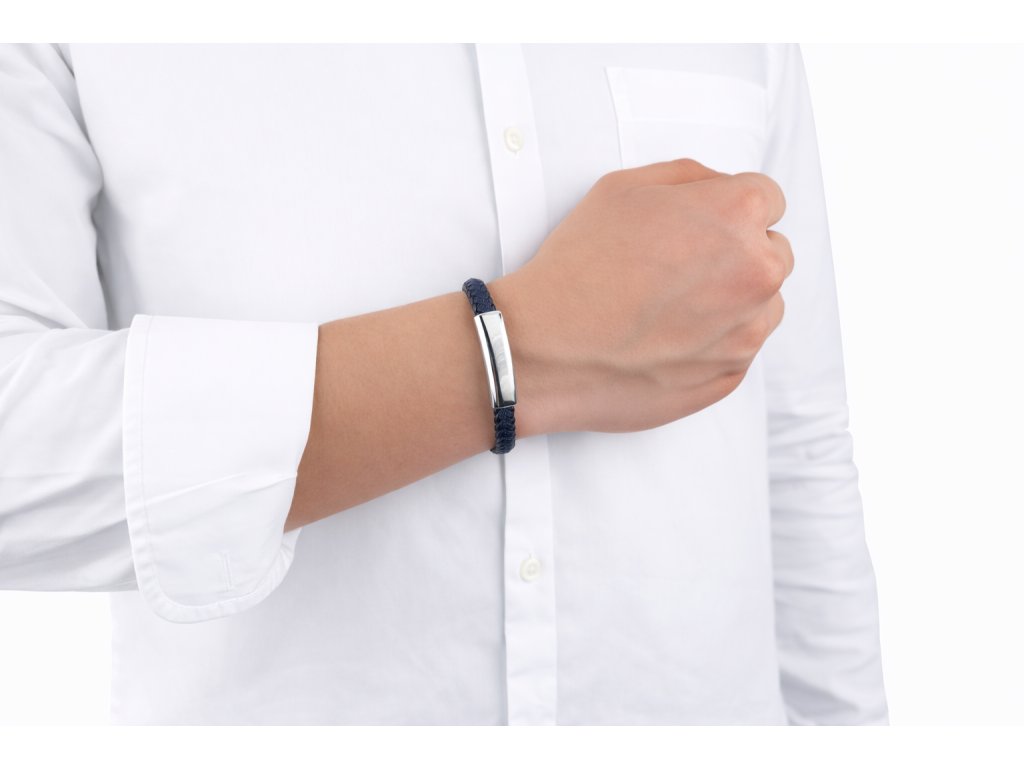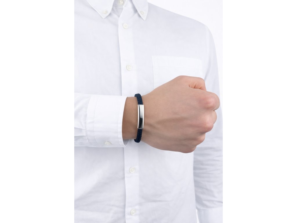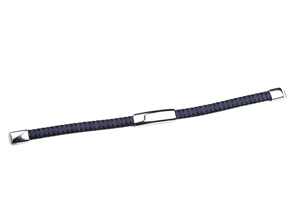Tento luxusní náramek zaujme na první pohled svou vytříbenou kombinací tmavě modré barvy a lesklého kovového detailu. Precizně pletená struktura působí lehce, ale zároveň pevně, a vytváří harmonický kontrast k čistým liniím hladké kovové destičky. Celek působí sofistikovaně, moderně a velmi vkusně.