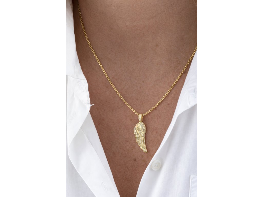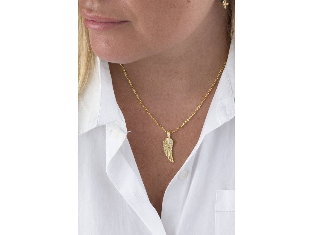 Přívěsek ve tvaru andělského křídla zaujme jemně propracovanými detaily, které podtrhují jeho symbolický význam i luxusní vzhled. Křídlo je vnímáno jako znak ochrany, svobody a duchovní síly, díky čemuž se šperk stává nejen elegantním doplňkem, ale i osobním talismanem. Nadčasový design umožňuje snadné kombinování s dalšími šperky a činí z přívěsku ideální volbu pro každodenní nošení i výjimečné okamžiky.