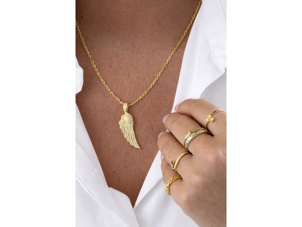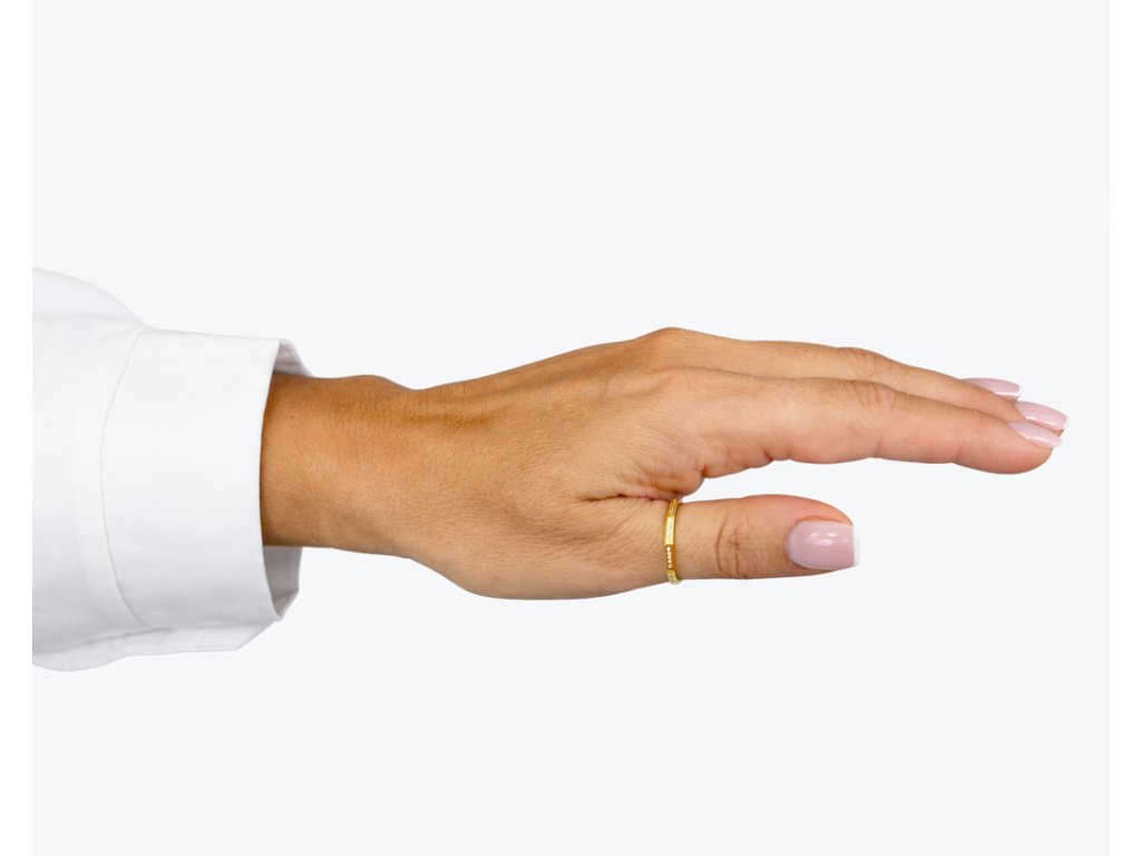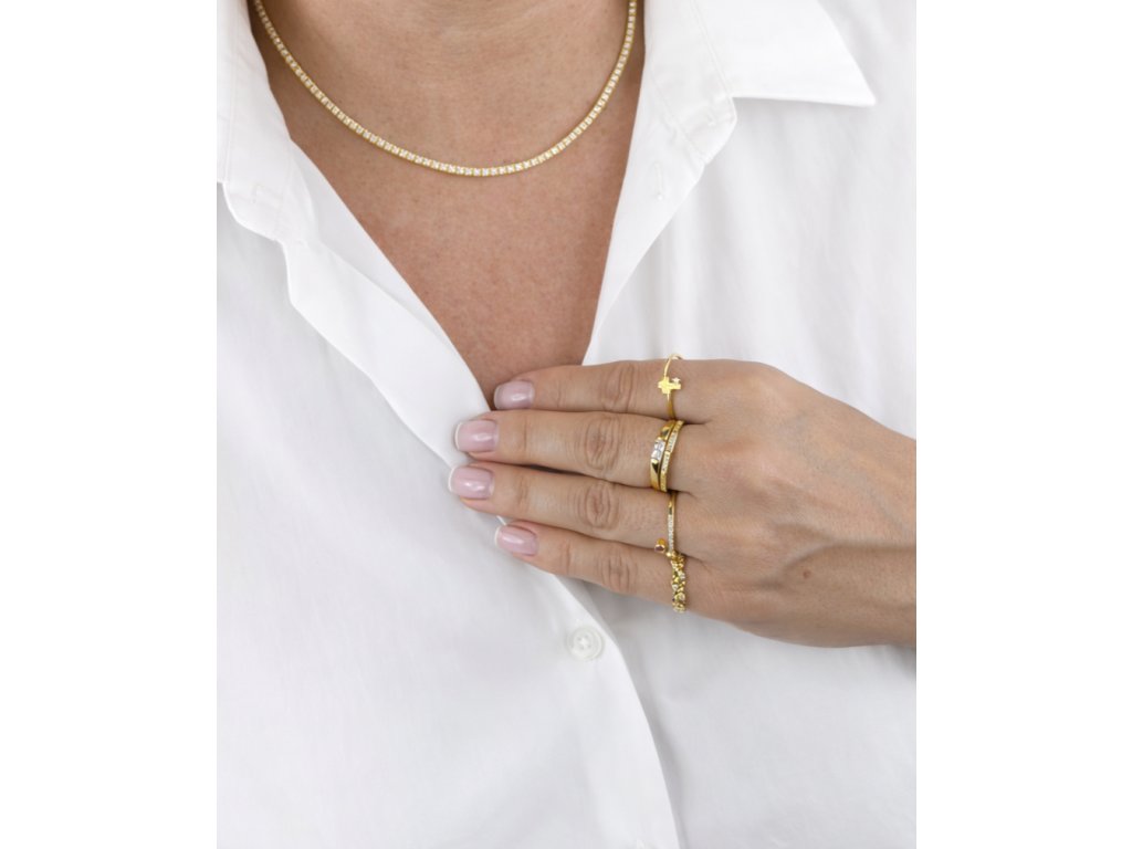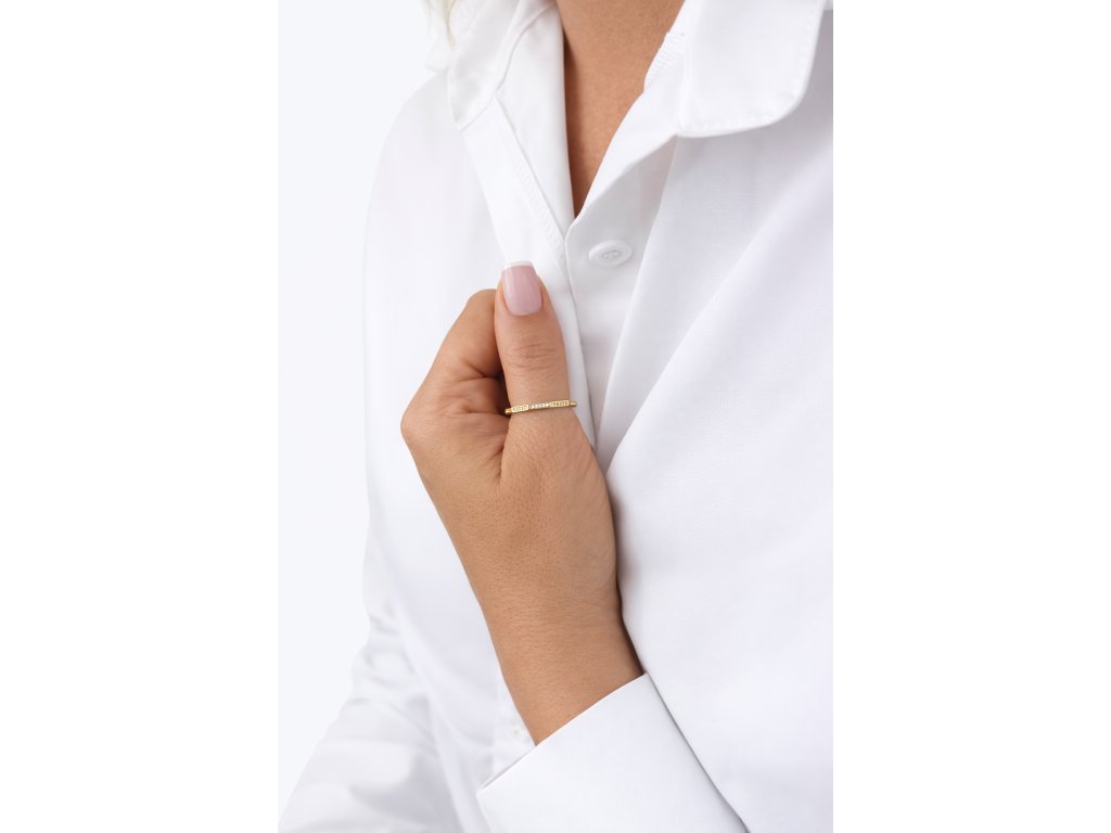Pozlacený stříbrný prsten zaujme svým precizním geometrickým designem, který dodává klasickému šperku moderní a sofistikovaný výraz. Jemně zapuštěné zirkony jsou uspořádány do elegantních linií, které prstenu propůjčují decentní třpyt a luxusní charakter, aniž by působil výrazně nebo přehnaně.