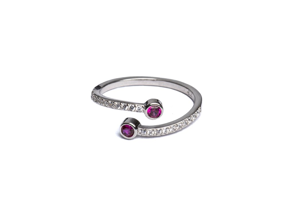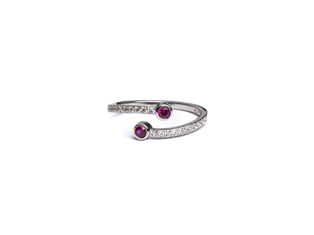 Stříbrný otevřený prsten je ztělesněním sofistikované elegance a moderního designu. Dva výrazné červené kameny na koncích obroučky vytvářejí harmonický kontrast s linií jemně vsazených zirkonů, které prstenu dodávají oslnivý třpyt. Otevřené provedení působí vzdušně, lehce a zároveň umožňuje pohodlné přizpůsobení velikosti.