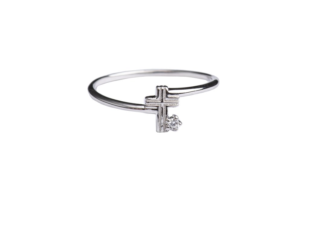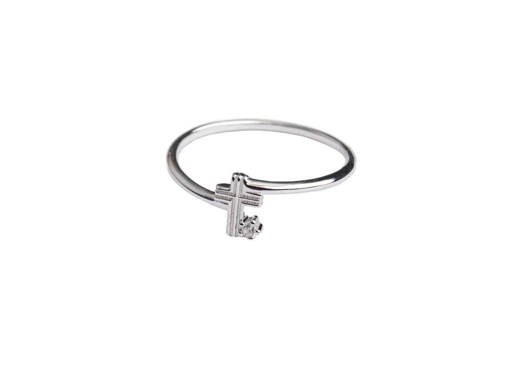 Prsten s křížkem a zirkonem, stříbrný (rhodium)