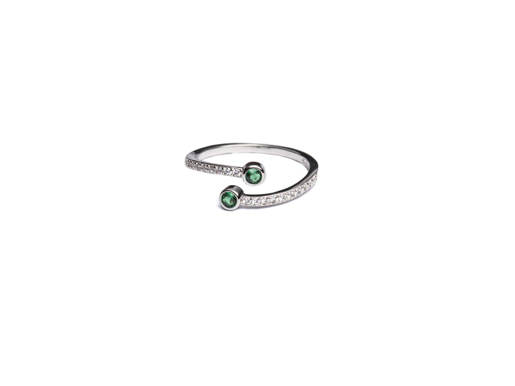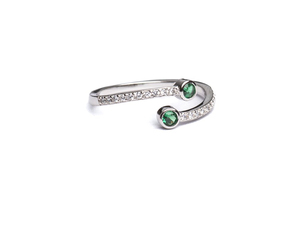 Stříbrný otevřený prsten představuje dokonalou kombinaci jemného luxusu a současné elegance. Dva výrazné zelené kameny na koncích obroučky vytvářejí harmonický kontrast s linií precizně vsazených zirkonů, které šperku dodávají oslnivý třpyt a sofistikovaný vzhled.