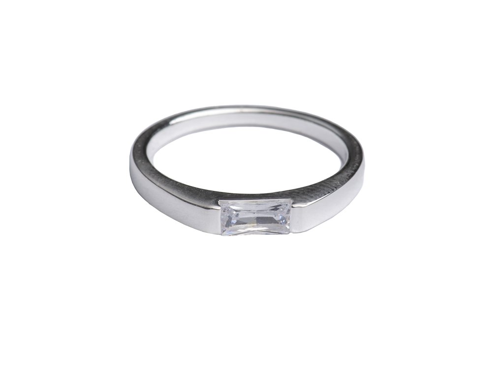 Stříbrný prsten je dokonalým příkladem moderního minimalismu a sofistikovaného stylu. Precizně broušený zirkon obdélníkového tvaru je elegantně zasazen do hladké obroučky, která podtrhuje jeho čirost a brilantní lesk. Čisté linie a vyvážené proporce dodávají šperku nadčasový charakter.
